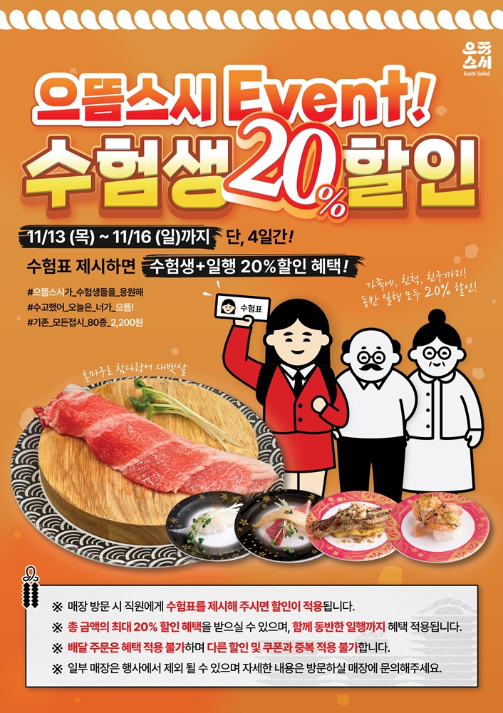 으뜸스시는 '수고했어, 너가 으뜸으로!'라는 슬로건 아래, 시험 준비로 지친 수험생들이 가족이나 친구와 함께 편안한 식사 시간을 보낼 수 있도록 이번 행사를 마련했다. 수험표를 제시하면 본인뿐 아니라 동반 일행도 동일한 할인 혜택을 받을 수 있다.