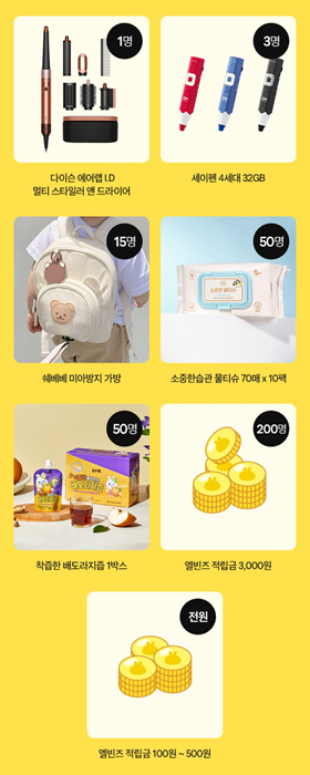 또한 ‘꽝 없는 경품 뽑기 이벤트’를 통해 고객 참여의 재미를 더했다. 엘빈즈 택배박스에 동봉된 쿠폰 번호 등록이나 출석체크 등을 통해 뽑기권을 받을 수 있으며, 주요 경품으로는 △다이슨 에어랩 I.D 멀티 스타일러 앤 드라이어(1명) △세이펜 4세대(3명) △쉐베베 미아방지 가방(10명) △소중한습관 물티슈(50명) 등 실생활에 도움이 되는 육아템들이 준비됐다.