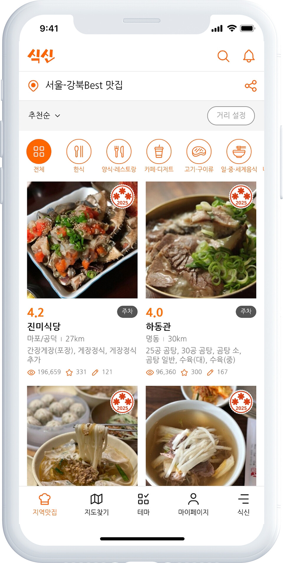 식신 앱은 직관적인 세 가지 메뉴 구조로 이루어져 있다. ‘지역맛집’에서는 한식, 양식, 일·중식, 세계음식, 카페, 고기, 나이트라이프 등 기본 카테고리를 중심으로 지역별 대표 맛집을 검색할 수 있다. ‘지도찾기’에서는 위치 기반으로 식당을 탐색할 수 있으며, 특히 식신이 엄선한 ‘별 맛집’이 지도 위에 표시돼 사용자들이 직관적으로 믿을 만한 식당을 찾을 수 있다. 마지막으로 ‘테마’에서는 다양한 기획형 미식 큐레이션이 준비돼 있다.