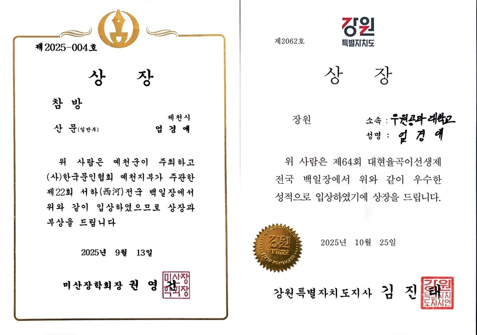 엄경애 학생은 지난 9월 13일 제22회 서하(西河)전국백일장 산문 일반부에서 '참방'을 수상한 데 이어, 10월 25일 제64회 대현율곡이선생제 전국 백일장에서 '장원'을 차지하며 연속 입상의 영예를 안았다.
