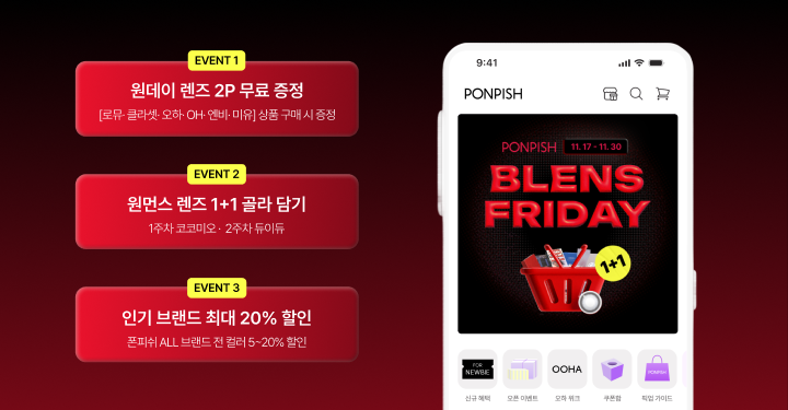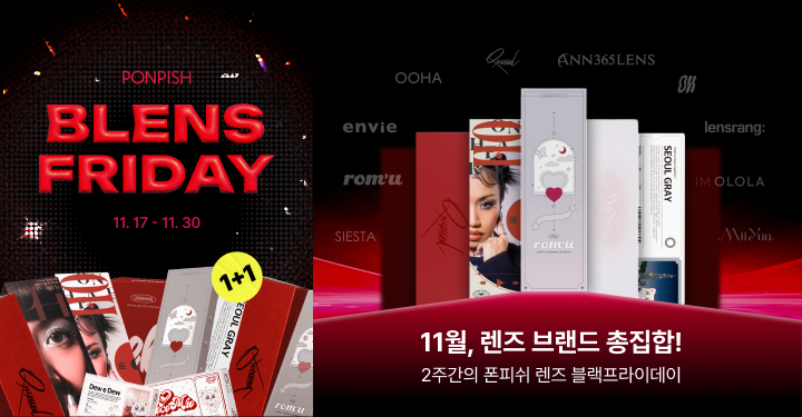 이번 블렌프라이데이는 11월 블랙프라이데이를 맞아 대표 제품과 인기 컬러렌즈 브랜드를 중심으로 진행되는 대규모 프로모션이다. 이번 프로모션은 11월 30일까지 순차적으로 운영되며, 소비자들이 다양한 렌즈 라인업을 보다 실속 있게 경험할 수 있도록 원먼스 구매 시 1+1 혜택과 원데이 구매 시 최대 20% 할인, 오하 원데이 2P 증정 등 다양한 이벤트가 기획되었으며, 주차별로 다른 브랜드의 혜택을 풍성하게 만나볼 수 있다.