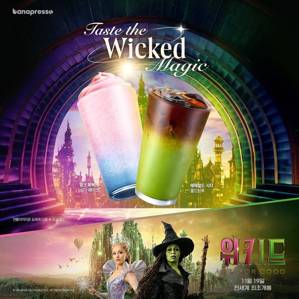 이번 협업은 영화의 대표적인 컬러 모티프인 에메랄드와 핑크를 바나프레소만의 감성으로 재해석해 시각·미각 모두에서 ‘위키드 감성’을 경험할 수 있도록 기획됐다.