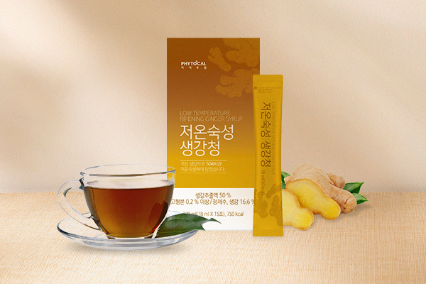 파이토컬 ‘저온숙성 생강청 스틱’은 국내산 생강을 504시간 동안 0~10℃에서 천천히 숙성하는 방식으로 만들어져, 생강 특유의 향과 풍미를 부드럽게 즐길 수 있게 한 것이 특징이다. 여기에 유기농 황설탕을 사용해 생강의 매운맛은 줄이고 깊은 맛은 늘렸다.