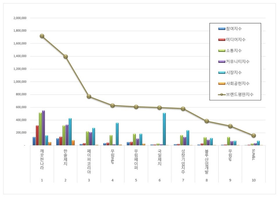 종이목재 상장기업 브랜드평판 1위를 기록한 깨끗한나라 브랜드는 참여지수 130,559 미디어지수 313,142 소통지수 513,226 커뮤니티지수 547,184 시장지수 159,213 사회공헌지수 54,065가 되면서 브랜드평판지수 1,717,389로 분석됐다. 지난 10월 브랜드평판지수 1,435,557과 비교해보면 19.63% 상승했다.