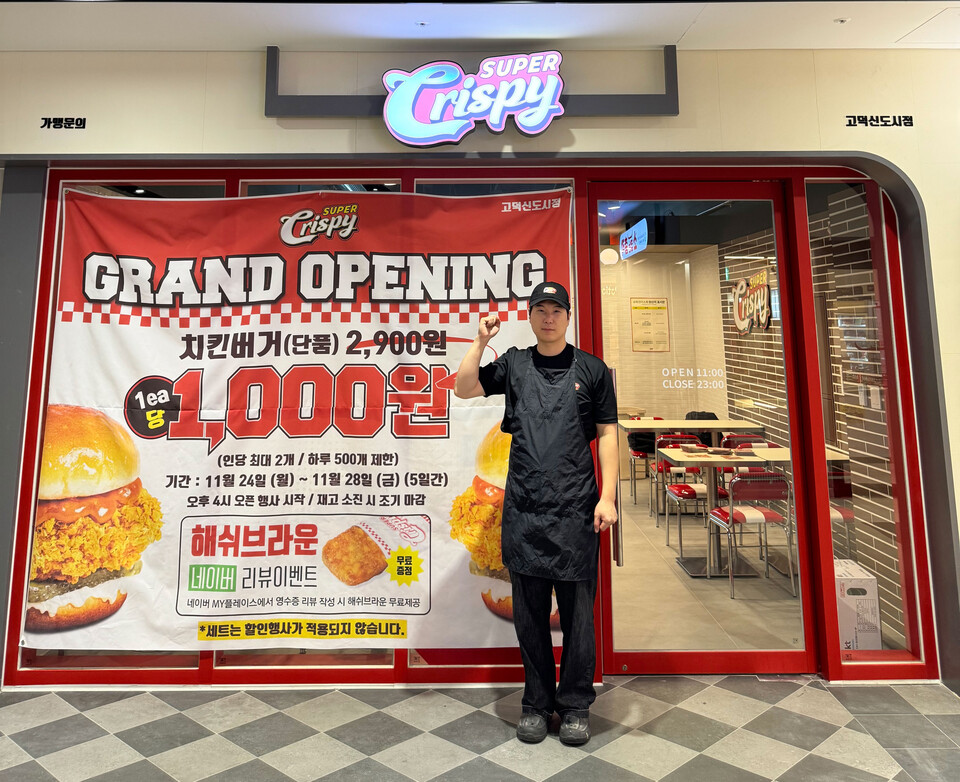 한편, 슈퍼크리스피 고덕신도시점은 오픈을 기념해 11월 28일까지 시그니처 치킨버거를 단 1,000원에 판매하며, 네이버 영수증 리뷰 작성 고객에게는 해쉬브라운 1개 무료 증정 이벤트도 진행된다.
