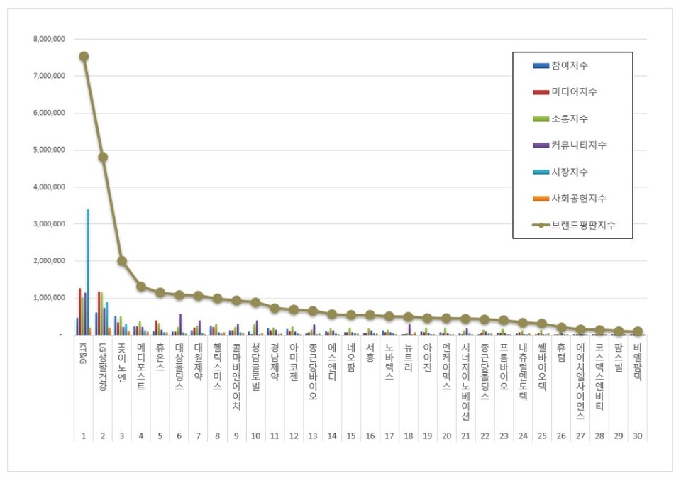 건강기능식품 관련 상장기업 브랜드평판 1위를 기록한 KT&G 브랜드는 참여지수 477,531 미디어지수 1,269,891 소통지수 1,025,264 커뮤니티지수 1,144,984 시장지수 3,409,583 사회공헌지수 205,979가 되면서 브랜드평판지수 7,533,232로 분석됐다. 지난 10월 브랜드평판지수 7,814,122와 비교해보면 3.59% 하락했다.