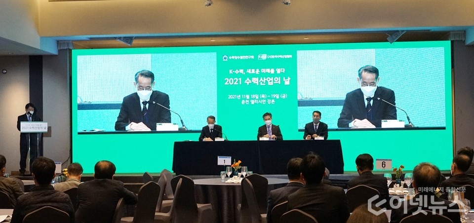 [이넷뉴스] 18일 개최된 '수력산업의 날' 행사에서 토크콘서트가 열리고 있다. 토크콘서트에서 한국수력산업협회 김은수 부회장이 발언하고 있다.