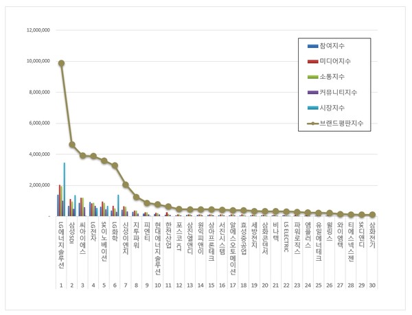 전력저장장치 ESS 관련 상장기업 브랜드평판 분석은 참여지수, 미디어지수, 소통지수, 커뮤니티지수, 시장지수로 구분해 브랜드평판지수를 산출했다.