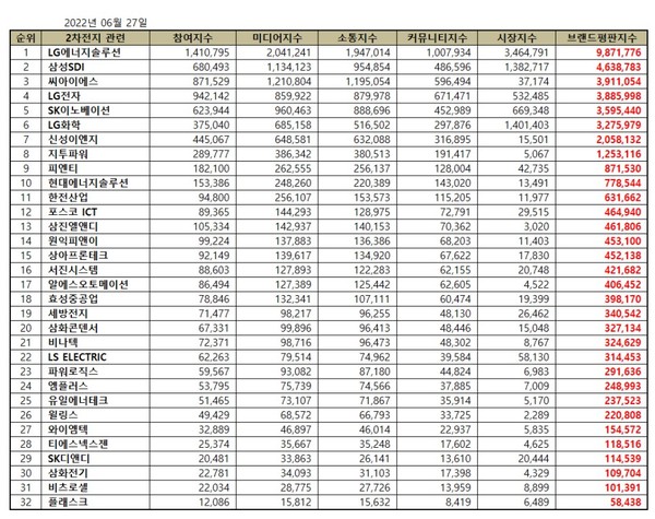 이넷뉴스 에너지 톱 브랜드위원회는 27일 전력저장장치 ESS 관련 상장기업 ‘2022년 6월 빅데이터 분석결과’를 발표했다. 발표에 따르면, 1위 LG에너지솔루션, 2위 삼성SDI, 3위 씨아이에스 순으로 나타났다.