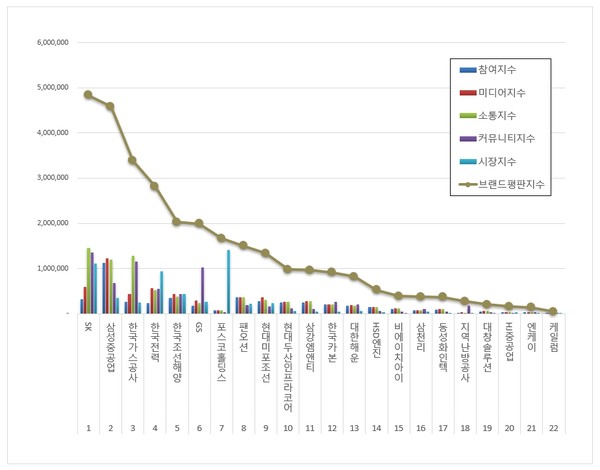 4위 한국전력(대표 정승일) 브랜드는 참여지수 242,040, 미디어지수 560,966, 소통지수 523,753, 커뮤니티지수 552,580, 시장지수 940,040이 되면서 브랜드평판지수 2,819,378로 분석됐다.