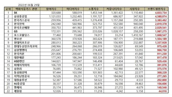 한국기업평판연구소는 국내 브랜드의 평판지수를 매달 측정하여 브랜드 평판지수의 변화량을 발표하고 있다. 2022년 6월 액화석유가스 LPG 관련 상장기업 브랜드평판지수는 2022년 5월 29일부터 6월 29일까지의 22개 액화석유가스 LPG 관련 상장기업 브랜드에 대한 빅데이터 분석 결과이다.