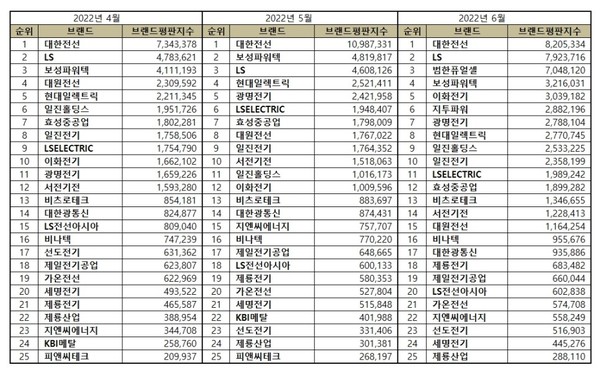 전기장비 상장기업 브랜드평판 2022년 6월 빅데이터 분석 순위는 대한전선, LS, 범한퓨얼셀, 보성파워텍, 이화전기, 지투파워, 광명전기, 현대일렉트릭, 일진홀딩스, 일진전기, LSELECTRIC, 효성중공업, 비츠로테크, 서전기전, 대원전선, 비나텍, 대한광통신, 제룡전기, 제일전기공업, LS전선아시아, 가온전선, 지엔씨에너지, 선도전기, 세명전기, 제룡산업, 피앤씨테크, KBI메탈 순이었다.