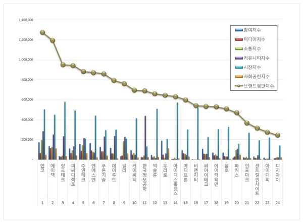 2위 에이텍(대표 신승영·이상훈) 브랜드는 참여지수 137,068, 미디어지수 114,792, 소통지수 128,422, 커뮤니티지수 250,469, 시장지수 450,639, 사회공헌지수 112,942이 되면서 브랜드평판지수 1,194,331으로 분석됐다. 지난 6월 브랜드평판지수 1,103,916와 비교하면 8.19% 상승했다.