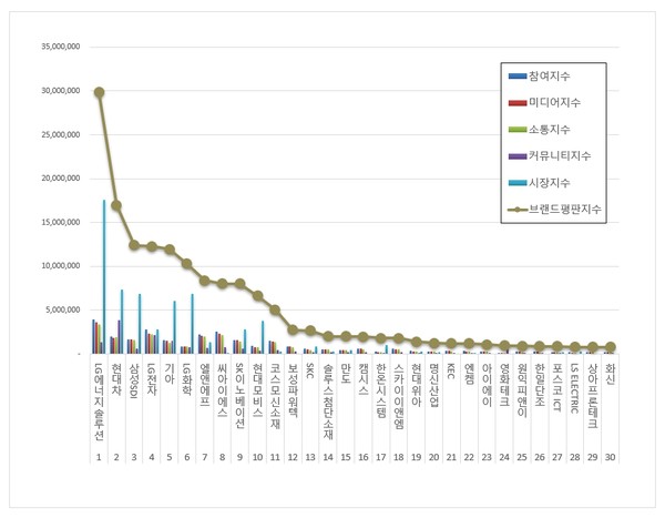 전기차 관련 상장기업 브랜드평판 1위를 기록한 1위 LG에너지솔루션(대표 권영수) 브랜드는 참여지수 3,942,797, 미디어지수 3,649,380, 소통지수 3,404,056, 커뮤니티지수 1,360,776, 시장지수 17,549,326이 되면서 브랜드평판지수 29,906,335로 분석됐다.
