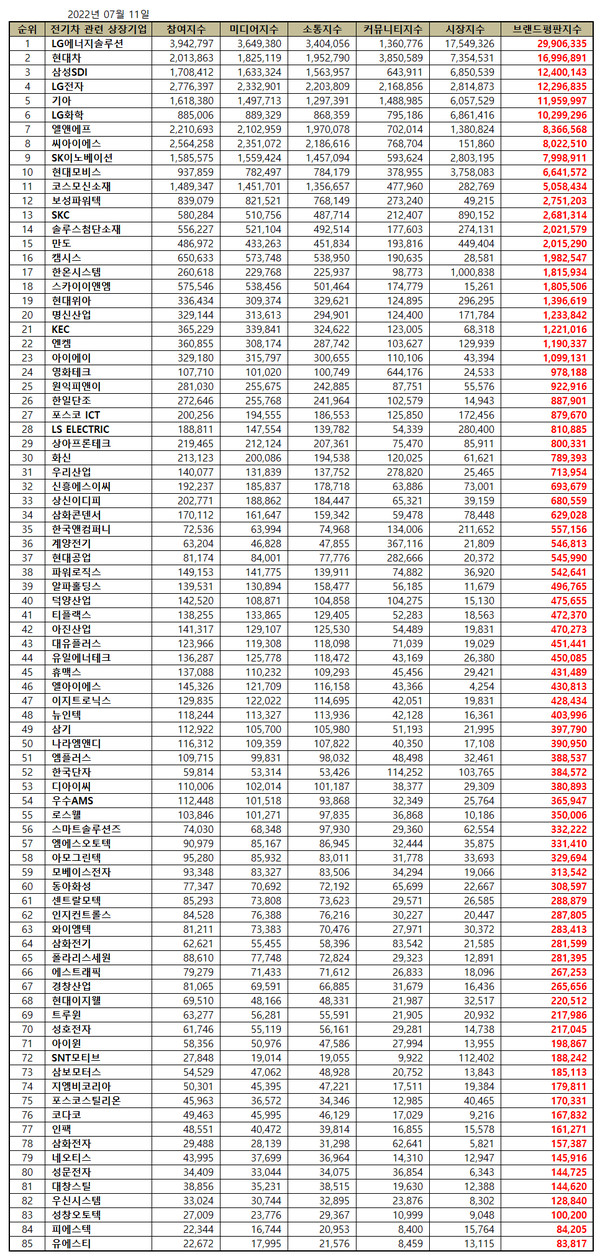 전기차 관련 상장기업 브랜드평판 2022년 7월 빅데이터 분석 30위 순위는 LG에너지솔루션, 현대자동차, 삼성SDI, LG전자, 기아, LG화학, 엘앤에프, 씨아이에스, SK이노베이션, 현대모비스, 코스모신소재, 보성파워텍, SKC, 솔루스첨단소재, 만도, 캠시스, 한온시스템, 스카이이앤엠, 현대위아, 명신산업, KEC, 엔켐, 아이에이, 영화테크, 원익피앤이, 한일단조, 포스코 ICT, LS ELECTRIC, 상아프론테크, 화신 순이었다.
