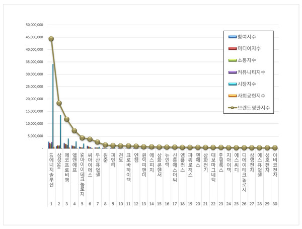 전기제품 상장기업 브랜드평판 1위를 기록한 LG에너지솔루션 ( 대표 권영수 ) 브랜드는 참여지수 2,710,435 미디어지수 2,204,034 소통지수 1,972,935 커뮤니티지수 2,620,913 시장지수 34,127,309 사회공헌지수 713,184가 되면서 브랜드평판지수 44,348,810으로 분석됐다. 지난 7월 브랜드평판지수 38,226,124와 비교하면 16.02% 상승했다.