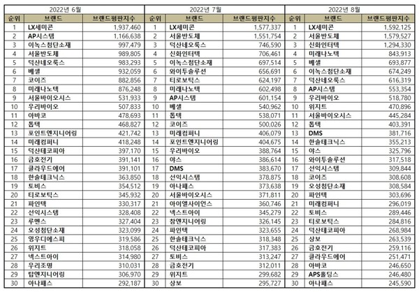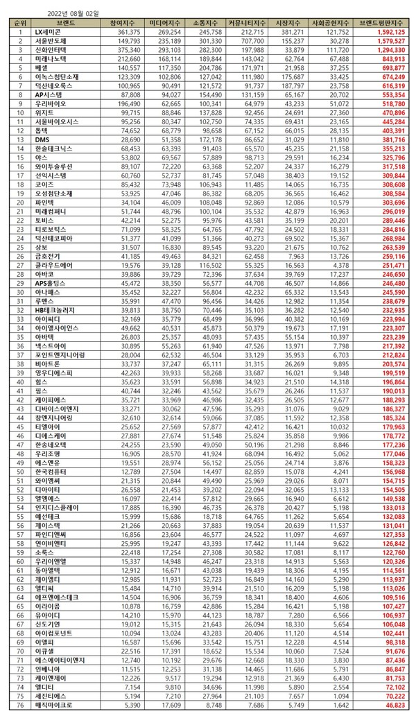2위, 대한전선 ( 대표 나형균 ) 브랜드는 참여지수 973,658 미디어지수 1,080,218 소통지수 1,054,401 커뮤니티지수 1,466,606 시장지수 145,786이 되면서 브랜드평판지수 4,720,669로 분석됐다. 지난 7월 브랜드평판지수 6,630,537과 비교하면 28.80% 하락했다.