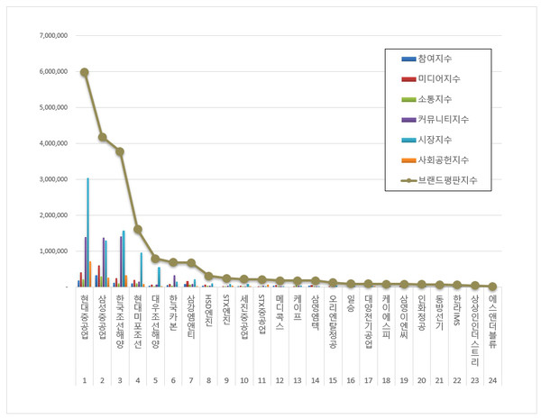 5위, 대우조선해양 ( 대표 박두선 ) 브랜드는 참여지수 36,577 미디어지수 68,356 소통지수 31,838 커뮤니티지수 70,244 시장지수 561,533 사회공헌지수 24,323이 되면서 브랜드평판지수 792,871로 분석됐다. 지난 7월 브랜드평판지수 2,105,793과 비교하면 62.35% 하락했다.