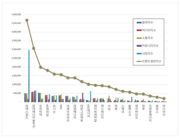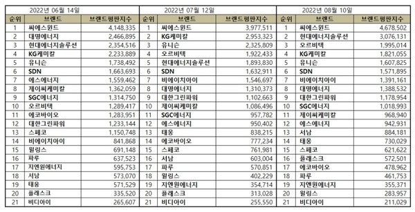 한편, 이넷뉴스 에너지 톱 브랜드위원회와 한국기업평판연구소는 매달 국내 에너지 기업 및 브랜드 평판지수를 측정해 변화량을 발표하고 있다. 국내 에너지 업계 현황을 파악하고, 에너지 산업을 전망하는 데 중요 지표가 되고 있다는 평가를 받고 있다.