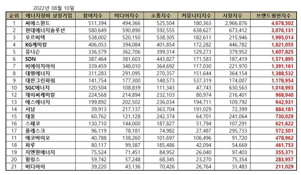 2022년 8월 에너지장비 상장기업 브랜드평판 빅데이터 분석 순위는 씨에스윈드, 현대에너지솔루션, 오르비텍, KG케미칼, 유니슨, SDN, 비에이치아이, 대명에너지, 대한그린파워, SGC에너지, 제이씨케미칼, 에스에너지, 서남, 태웅, 스페코, 플래스크, 에코바이오, 파루, 지엔원에너지, 윌링스, 비디아이 순이었다.