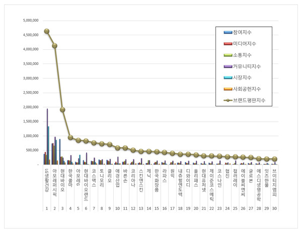 5위, 아모레G ( 대표 김승환 ) 브랜드는 참여지수 99,100 미디어지수 85,860 소통지수 83,189 커뮤니티지수 220,639 시장지수 346,964 사회공헌지수 15,006이 되면서 브랜드평판지수 850,758로 분석됐다. 지난 7월 브랜드평판지수 897,315와 비교하면 5.19% 하락했다.