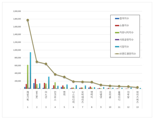 2위, SM C&C ( 대표 김동준, 남궁철 ) 브랜드는 참여지수 150,673 소통지수 258,543 커뮤니티지수 125,825 사회공헌지수 24,527 시장지수 142,080이 되면서 브랜드평판지수 701,648로 분석됐다. 지난 7월 브랜드평판지수 693,933과 비교하면 1.11% 상승했다.