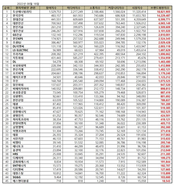 이넷뉴스 에너지 톱 브랜드위원회는 18일 원자력발전 관련 상장기업 ‘2022년 8월 빅데이터 분석결과’를 발표했다. 발표에 따르면, 1위 두산에너빌리티(구 두산중공업) 2위 한국전력(한전) 3위 현대건설 순으로 나타났다.