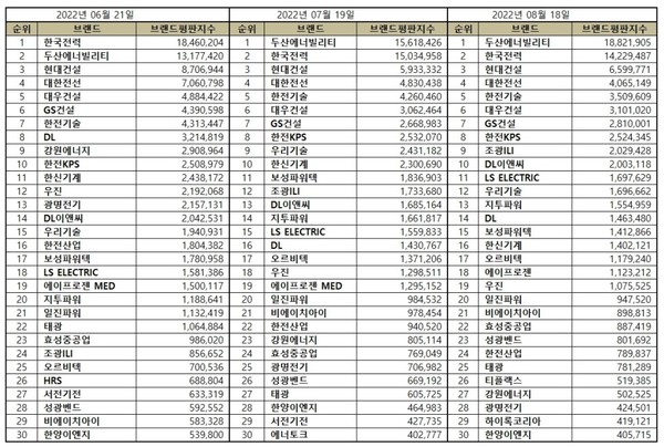 원자력발전 관련 상장기업 브랜드평판 2022년 8월 빅데이터 분석 30위 순위는 두산에너빌리티, 한국전력, 현대건설, 대한전선, 한전기술, 대우건설, GS건설, 한전KPS, 조광ILI, DL이앤씨, LS ELECTRIC, 우리기술, 지투파워, DL, 보성파워텍, 한신기계, 오르비텍, 에이프로젠, 우진, 일진파워, 비에이치아이, 효성중공업, 성광벤드, 한전산업, 태광, 티플랙스, 강원에너지, 광명전기, 하이록코리아, 한양이엔지 순이었다.
