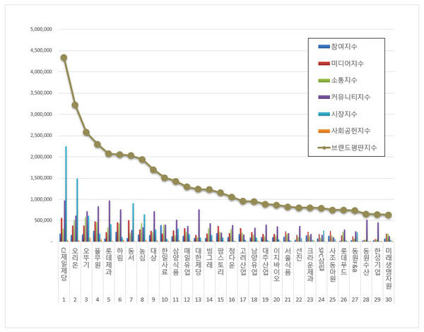 5위, 롯데제과 ( 대표 신동빈, 이영구 ) 브랜드는 참여지수 78,933 미디어지수 227,458 소통지수 343,744 커뮤니티지수 978,549 시장지수 418,815 사회공헌지수 25,196이 되면서 브랜드평판지수 2,072,695로 분석됐다. 지난 7월 브랜드평판지수 1,501,865와 비교하면 38.01% 상승했다.