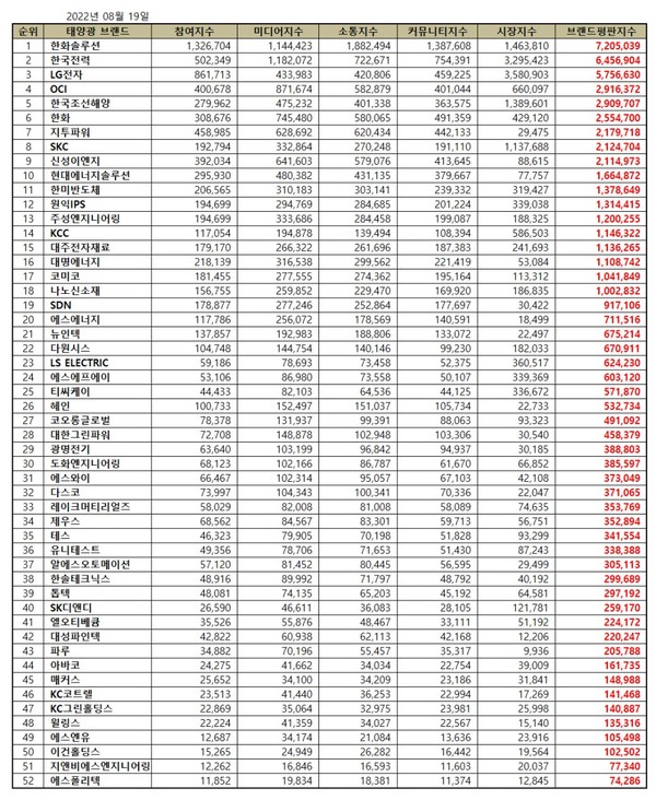 2022년 8월 태양광에너지 관련 상장기업 브랜드평판을 실시한 상장기업 브랜드는 한화솔루션, 한국전력, LG전자, 한국조선해양, OCI, 한화, SKC, 지투파워, 신성이엔지, 현대에너지솔루션, 한미반도체, 원익IPS, 대주전자재료, 주성엔지니어링, KCC, 대명에너지, 나노신소재, 코미코, SDN, 에스에너지, 뉴인텍, 다원시스, LS ELECTRIC, 에스에프에이, 티씨케이, 혜인, 코오롱글로벌, 대한그린파워, 도화엔지니어링, 광명전기, 다스코, 에스와이, 제우스, 레이크머티리얼즈, 유니테스트, 테스, 알에스오토메이션, 한솔테크닉스, 톱텍, SK디앤디, 엘오티베큠, 대성파인텍, 파루, 아바코, 매커스, KC코트렐, KC그린홀딩스, 윌링스, 에스엔유, 이건홀딩스, 지앤비에스엔지니어링, 에스폴리텍이다.