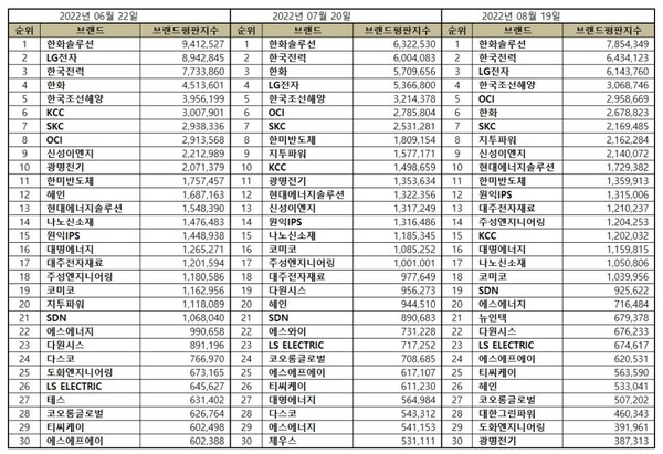 태양광에너지 관련 상장기업 브랜드평판 2022년 8월 빅데이터 분석 30위 순위는 한화솔루션, 한국전력, LG전자, 한국조선해양, OCI, 한화, SKC, 지투파워, 신성이엔지, 현대에너지솔루션, 한미반도체, 원익IPS, 대주전자재료, 주성엔지니어링, KCC, 대명에너지, 나노신소재, 코미코, SDN, 에스에너지, 뉴인텍, 다원시스, LS ELECTRIC, 에스에프에이, 티씨케이, 혜인, 코오롱글로벌, 대한그린파워, 도화엔지니어링, 광명전기 순이었다.