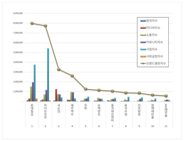 5위, 무학 ( 대표 최재호, 최낙준 ) 브랜드는 참여지수 77,477 미디어지수 71,985 소통지수 296,757 커뮤니티지수 310,137 시장지수 483,919 사회공헌지수 27,132가 되면서 브랜드평판지수 1,267,407로 분석됐다. 지난 7월 브랜드평판지수 2,236,476과 비교하면 43.33% 하락했다.
