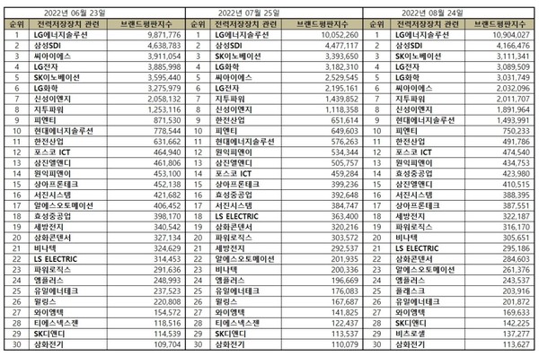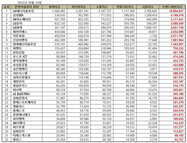 이넷뉴스 에너지 톱 브랜드위원회는 19일 전력저장장치 ESS 관련 상장기업 ‘2022년 8월 빅데이터 분석결과’를 발표했다. 발표에 따르면, 1위 LG에너지솔루션 2위 삼성SDI 3위 SK이노베이션 순으로 나타났다.