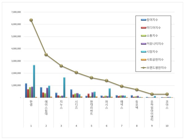 5위, 현대리바트 브랜드는 참여지수 151,074 미디어지수 324,443 소통지수 137,522 커뮤니티지수 439,715 시장지수 484,691 사회공헌지수 100,468이 되면서 브랜드평판지수 1,637,914로 분석됐다. 지난 7월 브랜드평판지수 1,605,919와 비교하면 1.99% 상승했다.