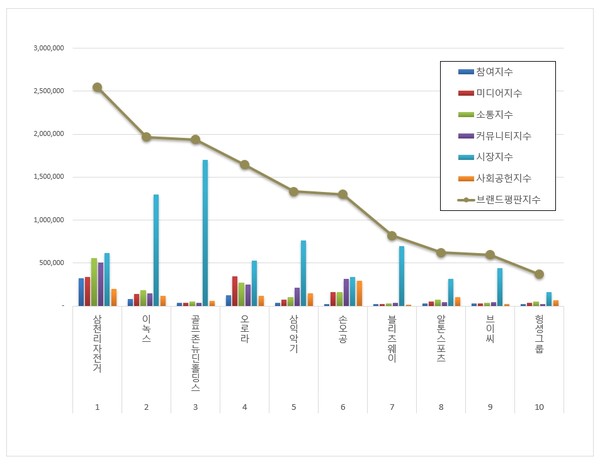 레저장비 상장기업 브랜드평판 1위를 기록한 삼천리자전거 ( 대표 신동호 ) 브랜드는 참여지수 325,897 미디어지수 341,435 소통지수 555,018 커뮤니티지수 503,875 시장지수 616,657 사회공헌지수 202,407이 되면서 브랜드평판지수 2,545,289로 분석됐다. 지난 7월 브랜드평판지수 2,570,643과 비교하면 0.99% 하락했다.
