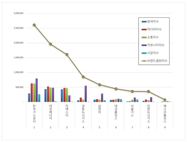 도시가스 상장기업 브랜드평판 1위를 기록한 한국가스공사 ( 대표 채희봉 ) 브랜드는 참여지수 292,259 미디어지수 629,053 소통지수 623,960 커뮤니티지수 797,390 시장지수 264,516이 되면서 브랜드평판지수 2,607,179로 분석되었다. 지난 8월 브랜드평판지수 1,993,805와 비교하면 30.76% 상승했다.