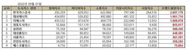 도시가스 상장기업 브랜드평판 2022년 9월 빅데이터 분석 순위는 한국가스공사, 대성에너지, 지에스이, 경동도시가스, 삼천리, 대성홀딩스, 서울가스, 인천도시가스, 예스코홀딩스 순이었다.