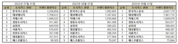 [이넷뉴스] 2022년 9월 도시가스 관련 상장기업 브랜드평판이 공개됐다.