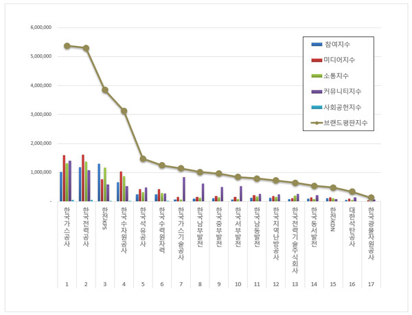 2위, 한국전력공사 ( 대표 정승일 ) 브랜드는 참여지수 1,183,829 미디어지수 1,609,158 소통지수 1,376,987 커뮤니티지수 1,074,163 사회공헌지수 55,130이 되면서 브랜드평판지수 5,299,267로 분석됐다. 지난 8월 브랜드평판지수 5,389,175과 비교하면 0.02% 하락했다.