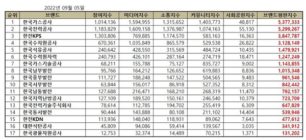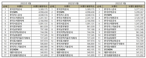 2022년 9월 에너지 공기업 브랜드평판 순위는 한국가스공사, 한국전력공사, 한전KPS, 한국수자원공사, 한국석유공사, 한국수력원자력, 한국가스기술공사, 한국남부발전, 한국중부발전, 한국서부발전, 한국남동발전, 한국지역난방공사, 한국전력기술주식회사, 한국동서발전, 한전KDN, 대한석탄공사, 한국광물자원공사 순으로 분석됐다.