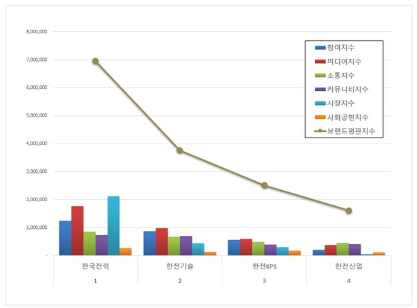 전기 유틸리티 상장기업 브랜드평판 1위를 기록한 한국전력 ( 대표 정승일, 한국전력공사 ) 브랜드는 참여지수 1,231,646 미디어지수 1,764,392 소통지수 849,030 커뮤니티지수 723,176 시장지수 2,122,474 사회공헌지수 262,865가 되면서 브랜드평판지수 6,953,582로 분석되었다. 지난 8월 브랜드평판지수 7,273,684와 비교하면 4.40% 하락했다.