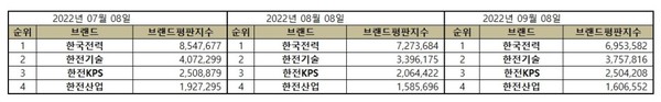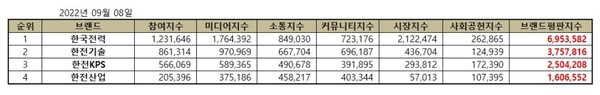 2022년 9월 전기 유틸리티 상장기업 브랜드평판 순위는 한국전력, 한전기술, 한전KPS, 한전산업 순으로 분석되었다.