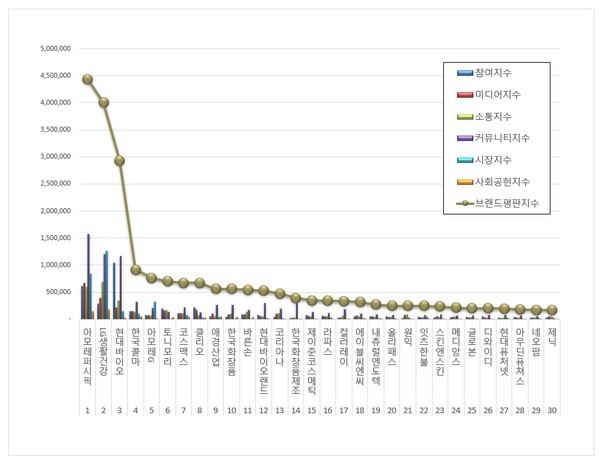 4위, 한국콜마 ( 대표 최현규 ) 브랜드는 참여지수 147,501 미디어지수 148,804 소통지수 138,905 커뮤니티지수 322,831 시장지수 105,219 사회공헌지수 51,692가 되면서 브랜드평판지수 914,951로 분석됐다. 지난 8월 브랜드평판지수 943,000과 비교하면 2.97% 하락했다.