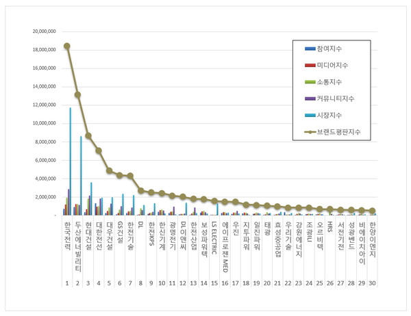 원자력발전 관련 상장기업 브랜드평판 분석은 참여지수, 미디어지수, 소통지수, 커뮤니티지수, 시장지수로 구분하여 브랜드평판지수를 산출했다.