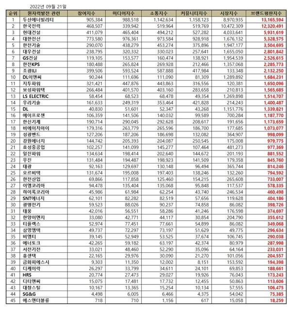 이넷뉴스 에너지 톱 브랜드위원회는 21일 원자력발전 관련 상장기업 ‘2022년 9월 빅데이터 분석결과’를 발표했다. 발표에 따르면, 1위 두산에너빌리티(구 두산중공업) 2위 한국전력(한전) 3위 현대건설 순으로 나타났다.
