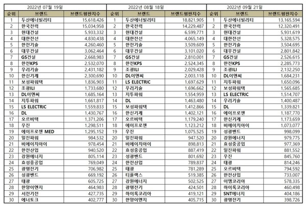 원자력발전 관련 상장기업 브랜드평판 2022년 9월 빅데이터 분석 30위 순위는 두산에너빌리티, 한국전력, 현대건설, 대한전선, 한전기술, 대우건설, GS건설, 한전KPS, 조광ILI, DL이앤씨, 지투파워, 보성파워텍, LS ELECTRIC, 우리기술, DL, 에이프로젠, 한신기계, 비에이치아이, 성광벤드, 강원에너지, 효성중공업, 일진파워, 우진, 태광, 오르비텍, 한전산업, 이엠코리아, 하이록코리아, SNT에너지, 광명전기 순이었다.