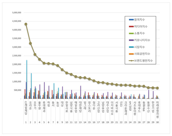 2위, 오리온 ( 대표 이승준 ) 브랜드는 참여지수 155,474 미디어지수 436,447 소통지수 512,350 커뮤니티지수 684,002 시장지수 1,380,101 사회공헌지수 41,115가 되면서 브랜드평판지수 3,209,490으로 분석됐다. 지난 8월 브랜드평판지수 3,222,563과 비교하면 0.41% 하락했다.