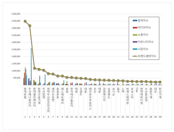 5위, 두산밥캣 ( 대표 스캇성철박, 조덕제 ) 브랜드는 참여지수 15,772 미디어지수 36,395 소통지수 95,628 커뮤니티지수 141,340 시장지수 765,981이 되면서 브랜드평판지수 1,055,116으로 분석됐다. 지난 8월 브랜드평판지수 1,092,675와 비교하면 3.44% 하락했다.