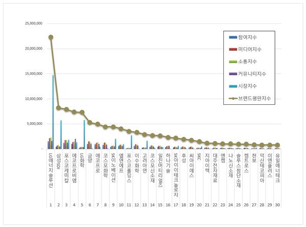 5위, LG화학 ( 대표 신학철 ) 브랜드는 참여지수 258,133 미디어지수 371,436 소통지수 487,980 커뮤니티지수 401,236 시장지수 5,822,618이 되면서 브랜드평판지수 7,341,403으로 분석되었다. 지난 8월 브랜드평판지수 7,670,274와 비교하면 4.29% 하락했다.