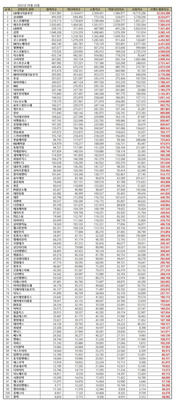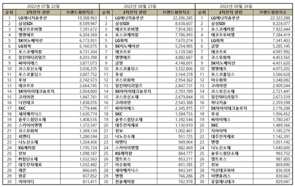 2차전지 관련 상장기업 브랜드평판 2022년 9월 빅데이터 분석 30위 순위는 LG에너지솔루션, 삼성SDI, 포스코케미칼, 에코프로비엠, LG화학, 금양, 에코프로, 코스모화학, SK이노베이션, 엘앤에프, 포스코홀딩스, 이수화학, 고려아연, 코스모신소재, 일진머티리얼즈, 하나기술, SK아이이테크놀로지, 후성, 씨아이에스, SKC, 지아이텍, 대주전자재료, 엔켐, 나노신소재, 솔루스첨단소재, 켐트로스, 천보, 덕산테코피아, 이엔플러스, 유일에너테크 순이었다.